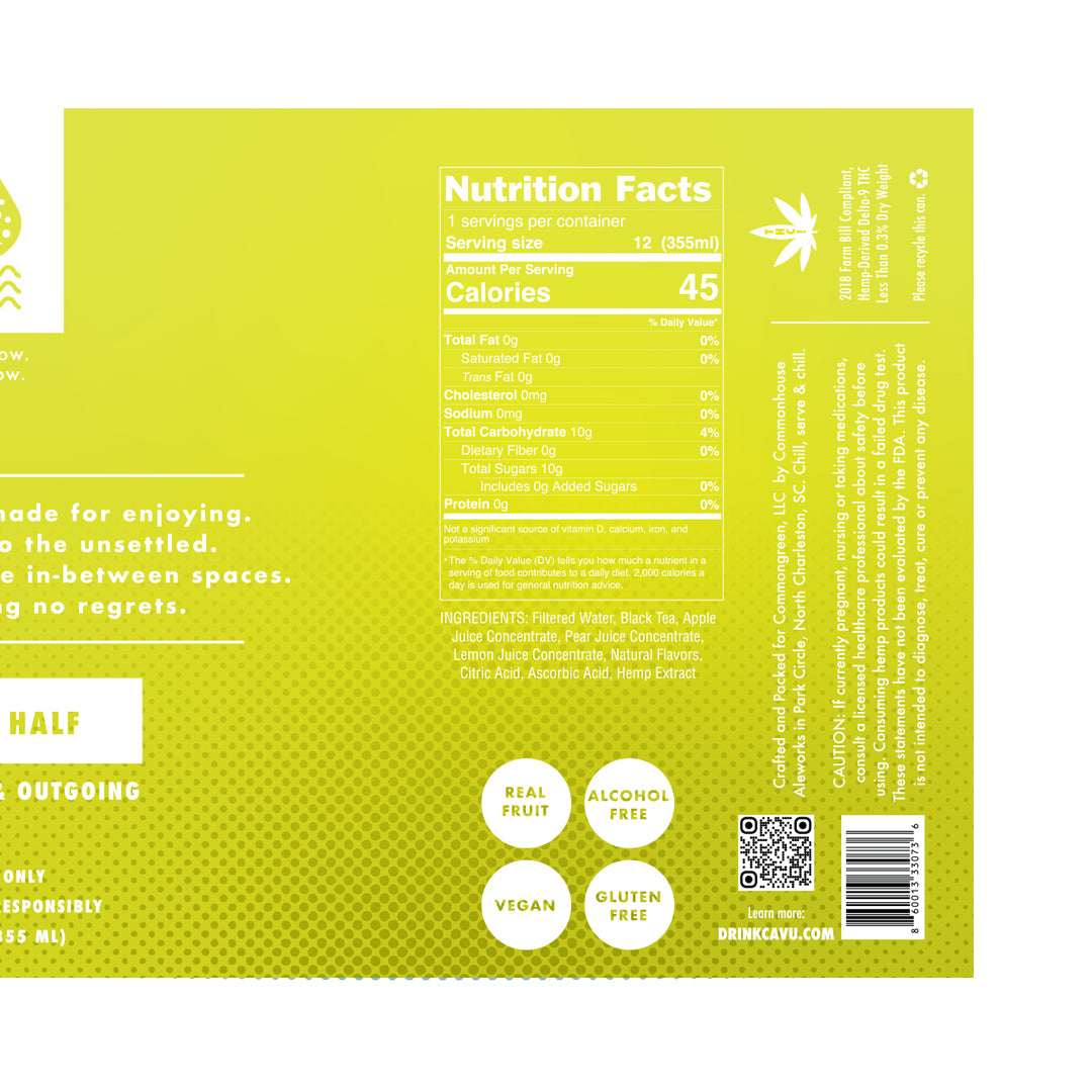 INGREDIENTS: FFiltered Water, Black Tea, Apple Juice Concentrate, Pear Juice Concentrate, Lemon Juice Concentrate, Natural Flavors, Citric Acid, Ascorbic Acid, Hemp Extract